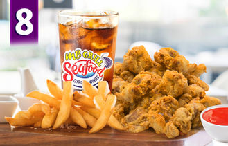 Our Seafood Platter is one piece of fish and ten pieces of shrimps served with Fries and drink.